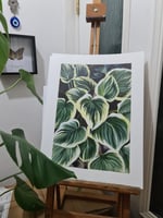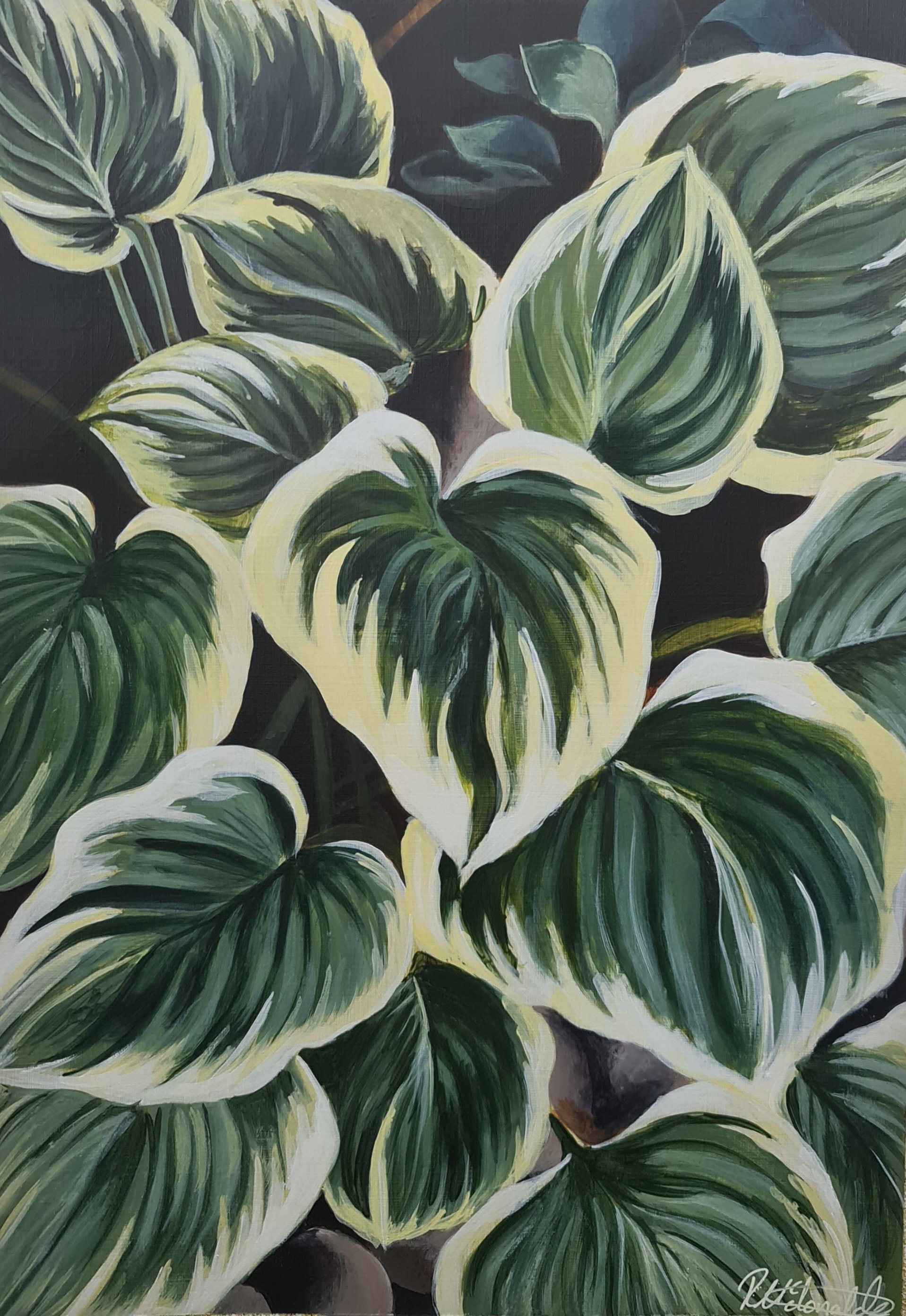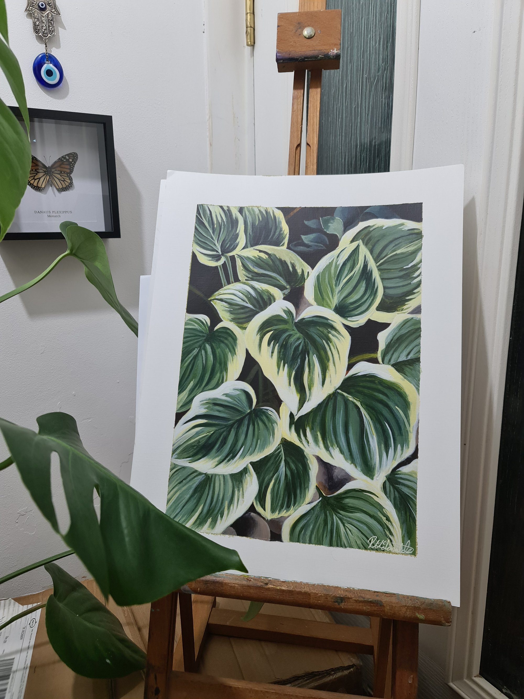 Hostas are a huge part of my indoor jungle, I adore the how each leaf is different yet replicates the same form and shape as its surrounding leaves, they make my home feel so full of life and nature. This painting has been created in acrylic whilst studying the specimen from life meaning this piece is truly unique and a one off.