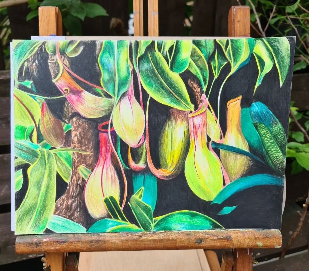 Fascinated with these alien like forms Rebecca was truly inspired by the unnatural looking forms we find in nature, this carnivorous plant is bold in shape and colour really drawing in the viewer. This piece has been created using the finest artist pencils on Bristol board.