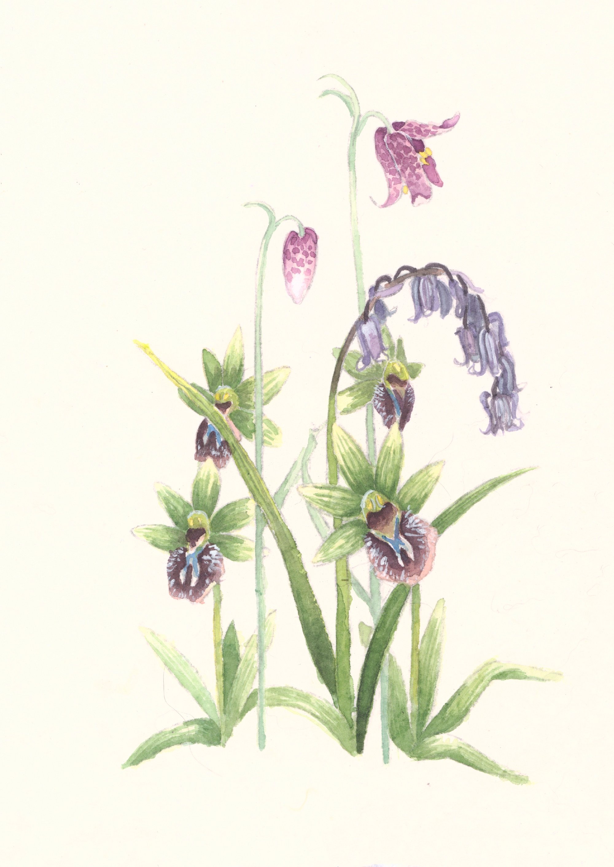 Exploring combinations of some of Britain's most endangered species Rebecca chose some of her favourite studies to combine and create delicate portraits of native flowers. This wonderful piece is created on hand made cotton rag paper allowing the luminosity of the watercolour to translate colour and pattern through translucent glazes.